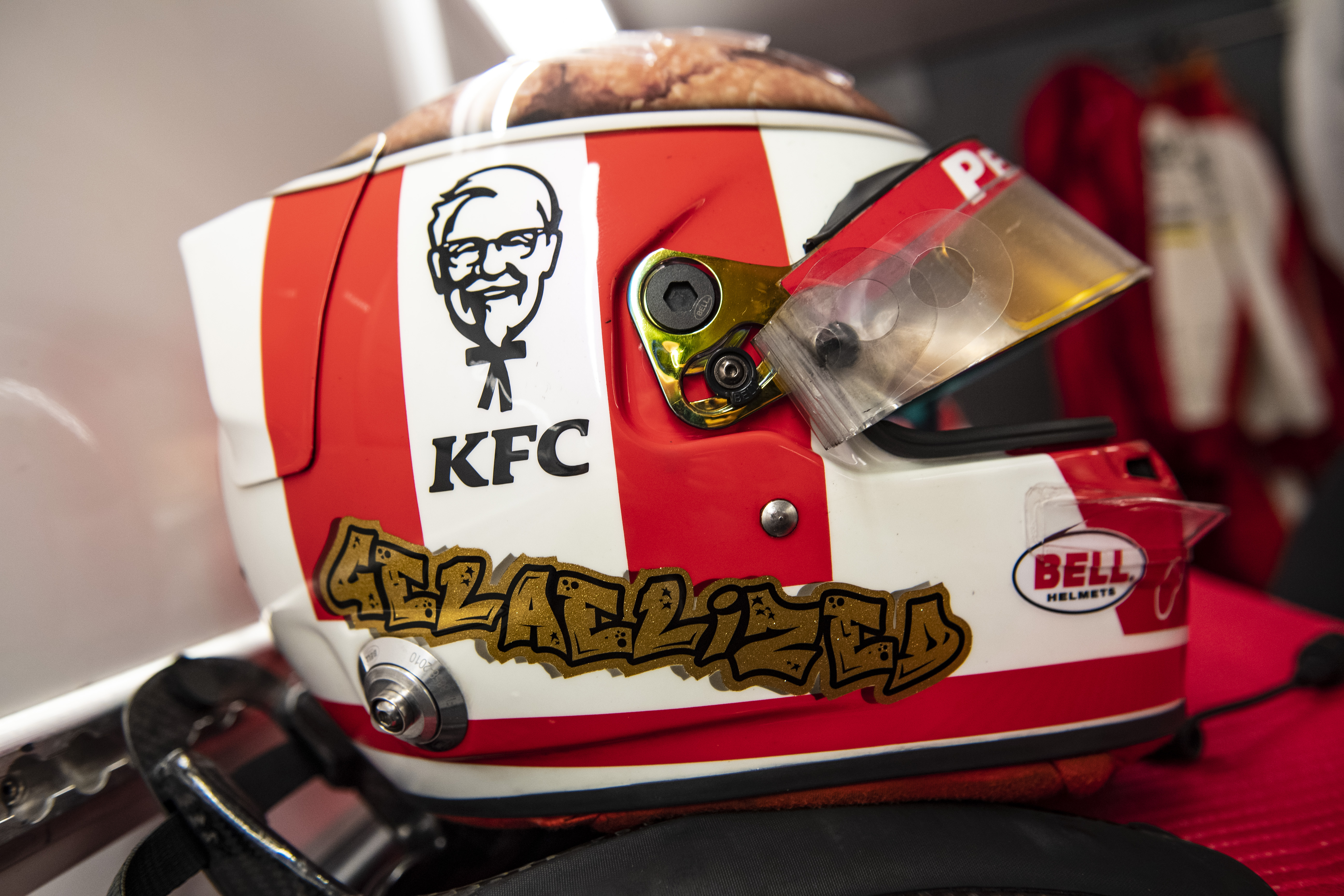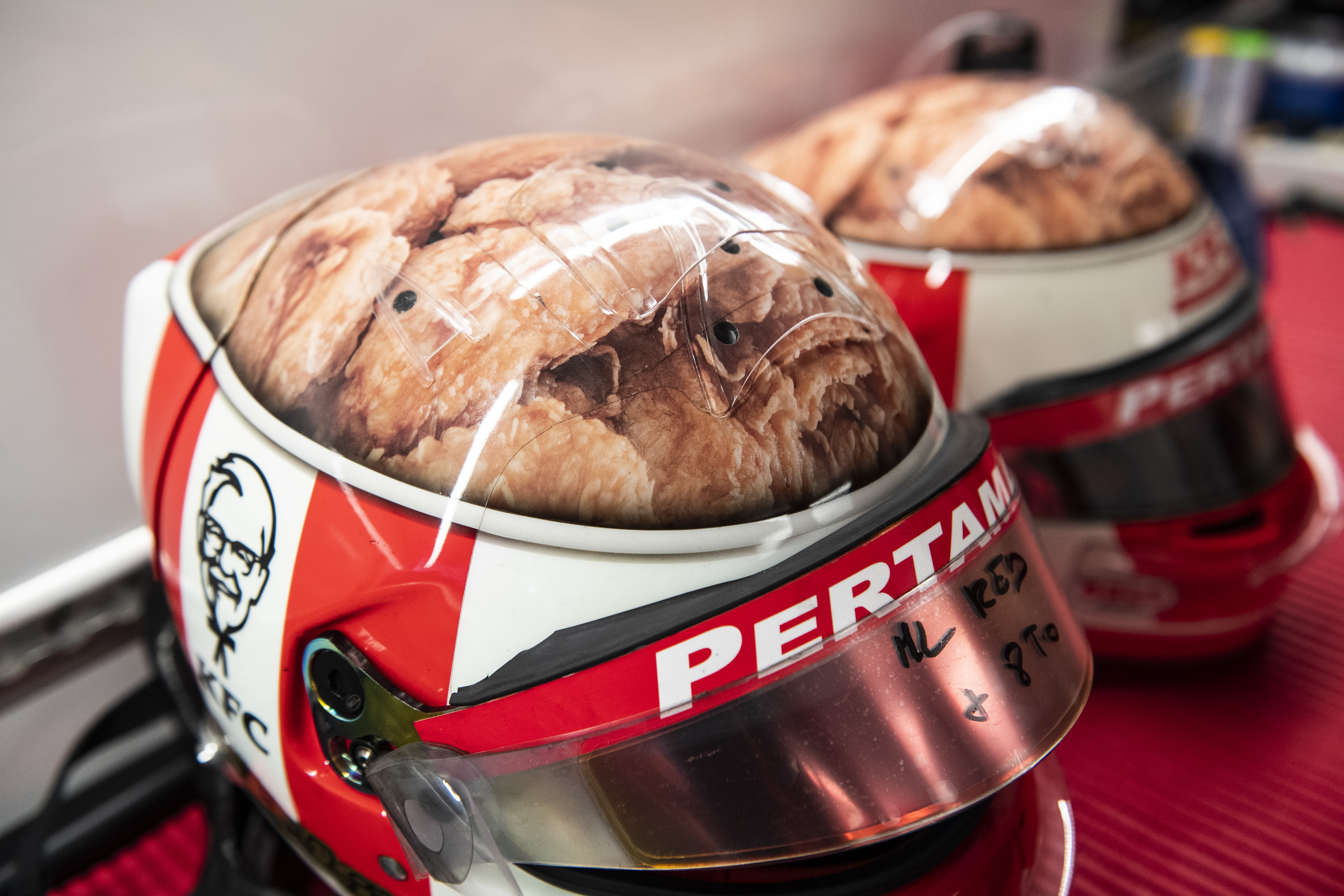 “I wanted to do something different, because my helmets have always been different. My first year of F2 was completely graffiti based, and then I went to a shoe design, and now I have gone for something that is a bit funnier, but could last longer. Basically, it is a KFC bucket, with a 12-piece chicken inside of it.