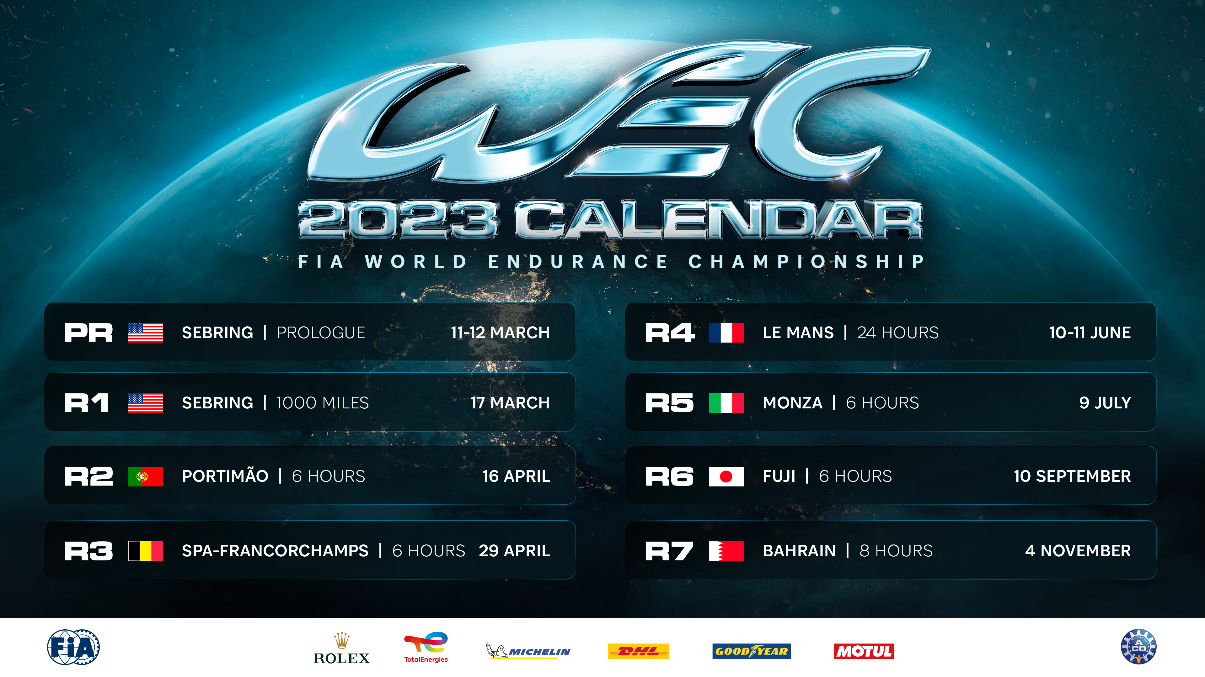 “We have all been eagerly awaiting the 2023 season since the introduction of the Hypercar category to the FIA World Endurance Championship. The line-up of iconic sportscar brands is testament to the work done in the background over the last couple of years and to the fact that the regulations are relevant to the manufacturers as well as proof of the growing appeal of endurance racing worldwide. The seven-round schedule is a natural evolution of the calendar we know well from the previous years that will provide the automakers involved with a stage to showcase their dream cars at a variety of world-class circuits and key global markets. The centenary edition of the 24 Hours of Le Mans will be the focal point of the season and Im immensely pleased that this has been taken into consideration when the Formula 1 calendar was approved by the World Motor Sport Council. This underlines the cooperation of the FIA as the governing body of world motor sport with the stakeholders of the worlds premier championships.”